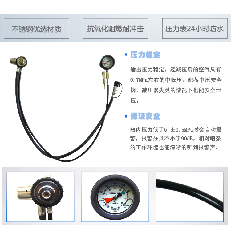 1.報警哨連同壓力表連接到使用者的胸前,這樣有利于使用者清楚地聽到報警聲,尤其適合多人同時在搶險救援的作業(yè)現(xiàn)場,很容易辨別出呼吸器報警。